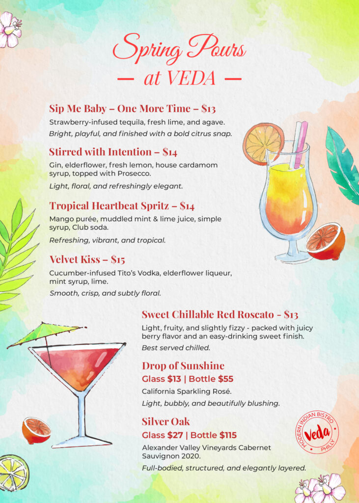 A confluence of two beautiful cultures coming together, Veda is a little bite of India located in the heart of Center City, Philadelphia. We serve traditional Indian Cuisine with a modern twist in a fine dining atmosphere, along with hand-crafted cocktails, and impeccable service. Come and explore the rich tastes and textures of Indian Cuisine at Veda – Modern Indian Bistro.